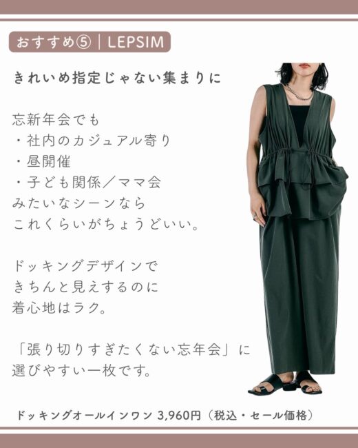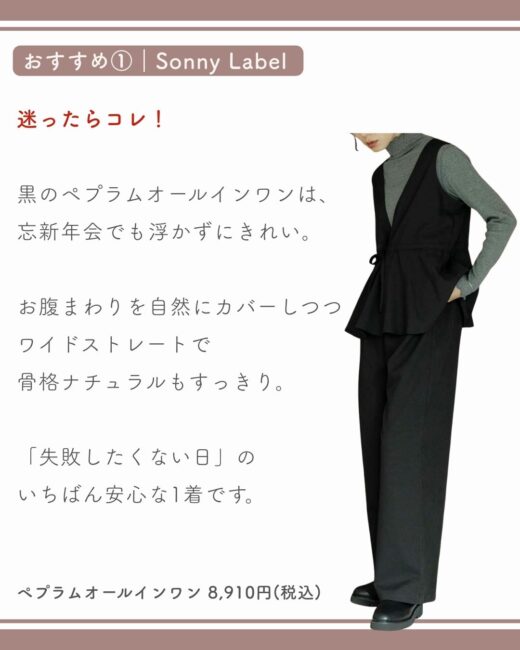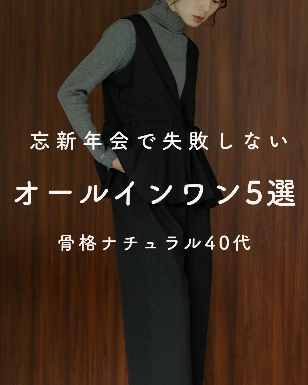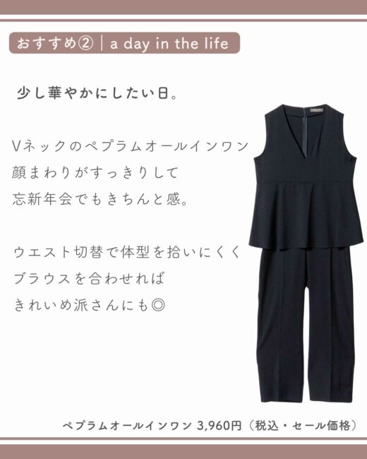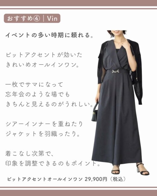 そんな悩みを持つ骨格ナチュラル40代に向けて、今回は忘新年会で浮かないオールインワンを厳選しました。