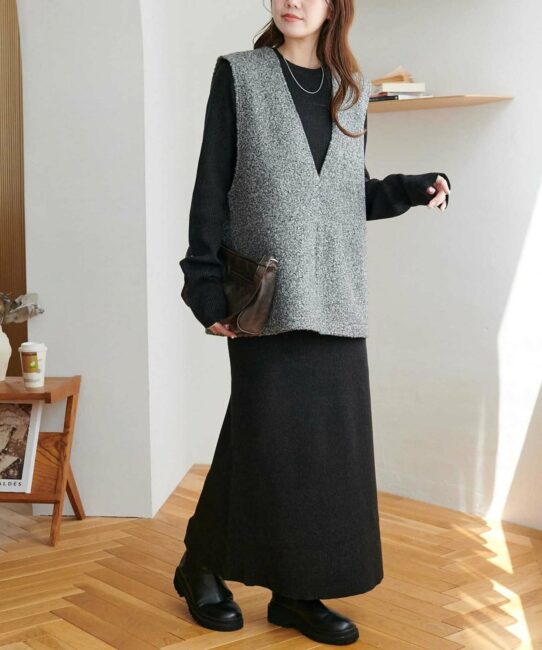 シンプルなリブニットにジレを重ねるだけで、立体感のある着こなしに。