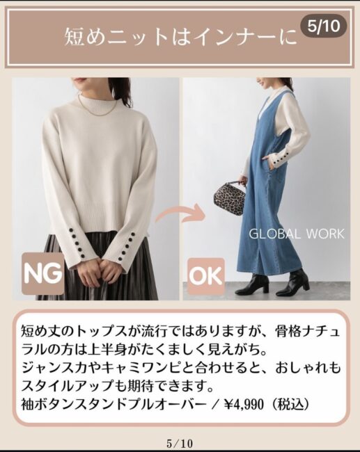 短め丈のニットはトレンドですが、骨格ナチュラルさんが一枚で着ると上半身がしっかり見えやすいアイテム。