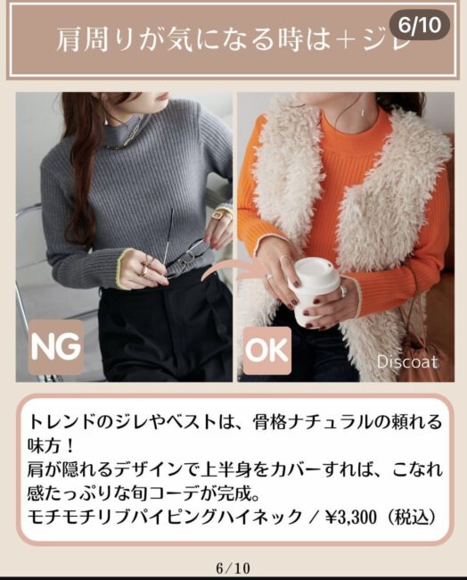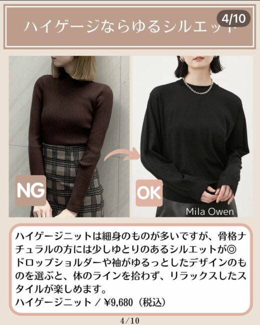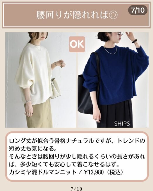 この記事では、インスタ投稿でも反響の大きかった「OK/NG比較」をもとに、40代・骨格ナチュラルさんがすっきり見えるニットの選び方を、骨格診断士の視点からわかりやすく解説します。